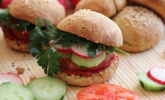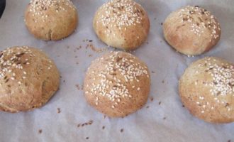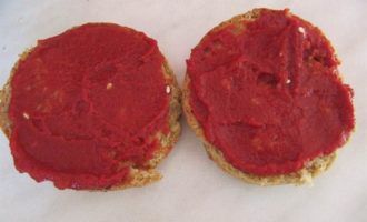 • Затем готовые булочки разрежьте пополам, смажьте соусом.