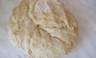 • Выложите тесто на стол присыпанной мукой. Намажьте руки маслом, чтобы тесто не прилипало и месите тесто.