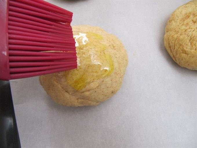• Из теста сформируйте булочки. Получается 6 шт. Аккуратно кисточкой обмажьте оливковым маслом.