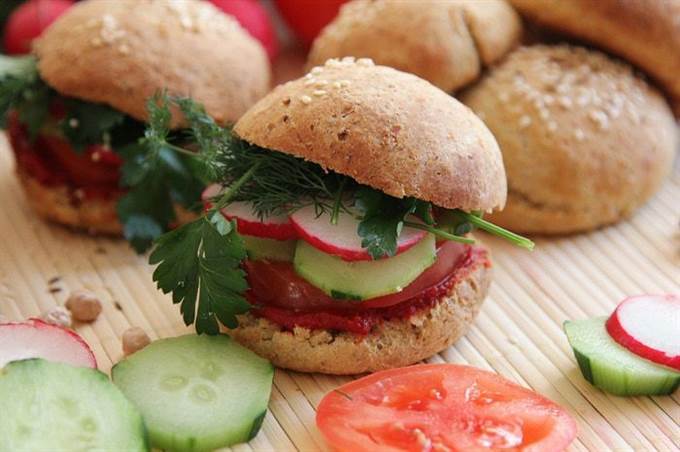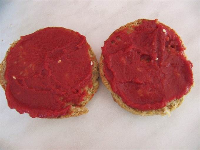 • Затем готовые булочки разрежьте пополам, смажьте соусом.