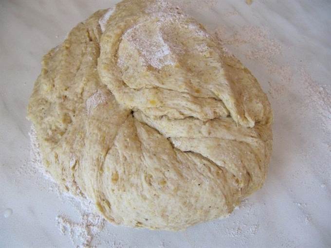 • Выложите тесто на стол присыпанной мукой. Намажьте руки маслом, чтобы тесто не прилипало и месите тесто.