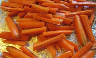 Морковь режем крупными брусочками и выкладываем ее в форму для запекания. Посыпаем ее кориандром и поливаем 2 ст.л. оливкового масла. Перемешиваем и запекаем минут 20 (или до желаемой степени готовности: кто-то любит помягче, а кто-то наоборот) в духовке 200 гр.