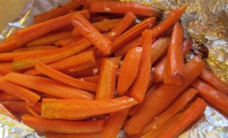 Достаем морковь из духовки, поливаем заправкой. По вкусу можно ее посыпать немного перчиком чили, нарезанным колечками (я этого не делала). Посыпаем ее рубленой кинзой или петрушкой. Я здесь немного отошла от рецепта и вернула морковь, уже заправленную, в духовку на некоторое время. На Ваше усмотрение.
