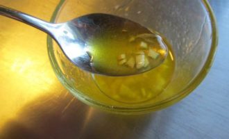 Для заправки смешиваем 2 ст.л. оливкового масла, мед, лимонный сок и измельченный зубчик чеснока.