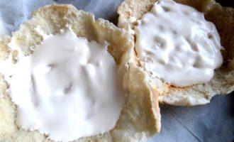 • Распределить по дну «тарелочки» густую сметану. Любители майонеза могут смешать её с майонезом.