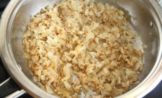 • Потушить лук и коренья на растительном масле (4 ст. л.) до готовности (15 — 20 минут).