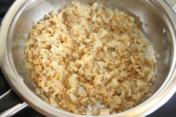 • Потушить лук и коренья на растительном масле (4 ст. л.) до готовности (15 — 20 минут).