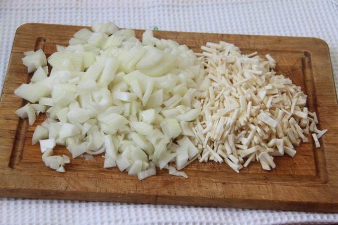 • Репчатый лук (320 г) и корень сельдерея (80 г) нарезать кубиком или бруском.