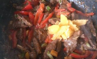 Добавить апельсины к мясу, приправить солью и перцем, прогреть 2-3 минуты, постоянно помешивая.
