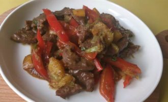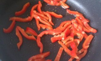 Перец нарезать тонкими полосками, разогреть 1 ст ложку масла и обжарить перец 4 минуты часто помешивая. Выложить на тарелку.