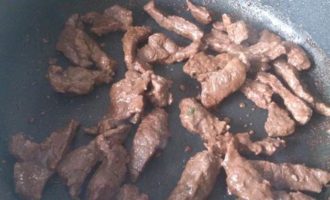 В сковороду добавить оставшееся масло и обжарить мясо 8-10 минут до золотистой корочки. Выложить к овощам.