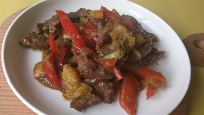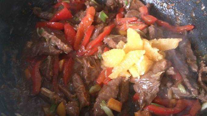Добавить апельсины к мясу, приправить солью и перцем, прогреть 2-3 минуты, постоянно помешивая.