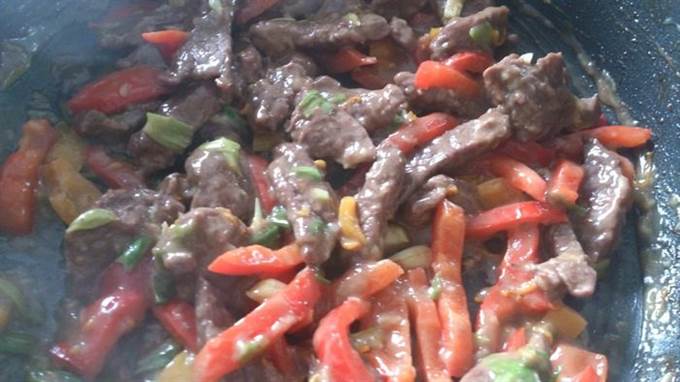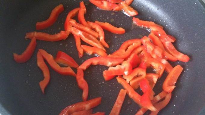 Перец нарезать тонкими полосками, разогреть 1 ст ложку масла и обжарить перец 4 минуты часто помешивая. Выложить на тарелку.
