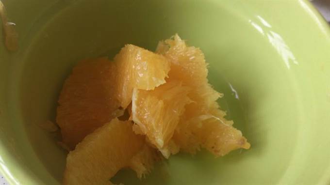 Апельсины очистить от кожуры, вырезать мякоть из сегментов.