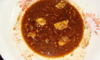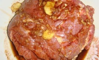 • Обмазать мясо маринадом и убрать в холодильник на 2 часа. Если есть время лучше оставить мясо мариноваться на ночь.