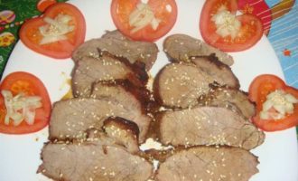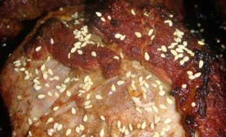 • Через 30 минут снять фольгу, полить мясо соком из формы и посыпать кунжутом. Запекать еще 30 минут, убавив температуру до 190°С.