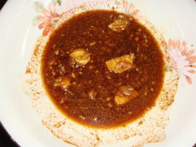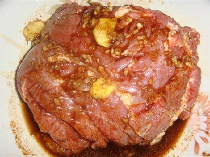 • Обмазать мясо маринадом и убрать в холодильник на 2 часа. Если есть время лучше оставить мясо мариноваться на ночь.