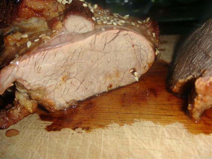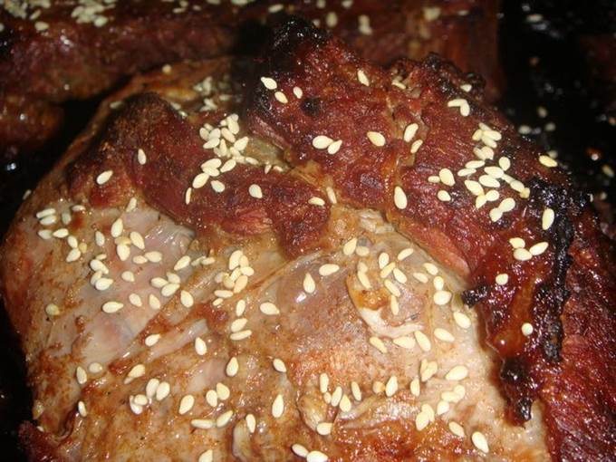 • Через 30 минут снять фольгу, полить мясо соком из формы и посыпать кунжутом. Запекать еще 30 минут, убавив температуру до 190°С.