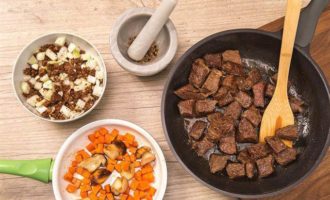 Говядину нарезать средними кусками и обжарить на растительном масле (2 ст. л.) при сильном нагреве.