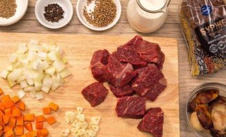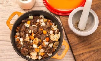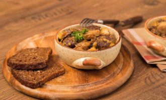 В кастрюлю выложить слоями 1/2 хлебно-луковой массы, мясо, морковь и грибы, снова хлеб. Добавить в кастрюлю около 2 стаканов воды (или бульона), влить сливки и поставить в разогретую до 190°С духовку на 1,5 — 2 часа (при необходимости добавить еще воды в процессе приготовления).