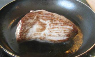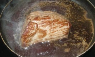 • В душистом масле быстро обжарил цельный кусок мяса со всех сторон.