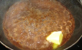 • Добавил огонь под сковородкой, чтобы оставшееся вино закипело. Посолил, поперчил и положил в него кусок сливочного масла (пятьдесят грамм).