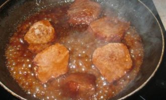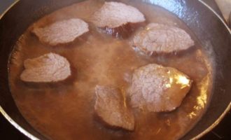 • Выложил в сковороду ломтики мяса, убавил огонь и оставил говядину пропитываться медленно густеющим соусом.