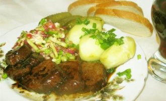 • Налил бокал сухого красного вина, дал ему закипеть, накрыл сковородку крышкой и оставил тушиться на небольшом огне. Мясо будет готово через двадцать минут, но останется упругим (резиновым). Через сорок минут оно уже будет мягким, сохранив легкую упругость. Мне так нравиться больше. Если вы хотите, что бы мясо было мягким как тушенка, долейте воды и оставьте тушиться на два часа.