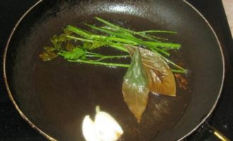 • Сначала нужно подготовить масло. В, разогретом на сковородке, растительном масле я обжарил раздавленный зубчик чеснока, листики лаврушки и веточки зелени. Это не только придаст маслу аромат, но и очистит его от ненужных примесей.