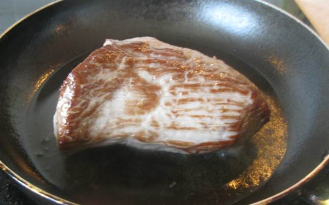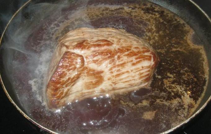 • В душистом масле быстро обжарил цельный кусок мяса со всех сторон.