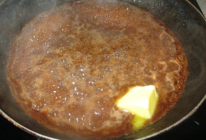 • Добавил огонь под сковородкой, чтобы оставшееся вино закипело. Посолил, поперчил и положил в него кусок сливочного масла (пятьдесят грамм).