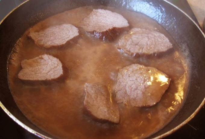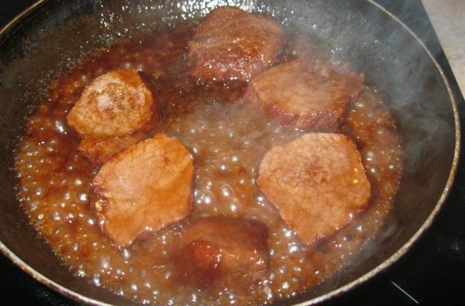 • Выложил в сковороду ломтики мяса, убавил огонь и оставил говядину пропитываться медленно густеющим соусом.