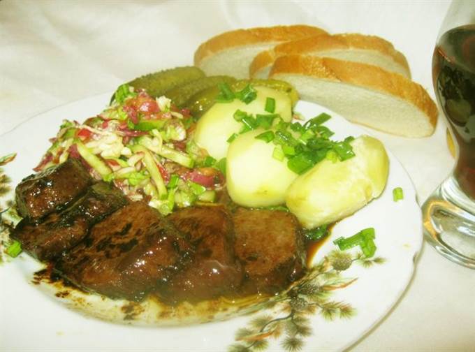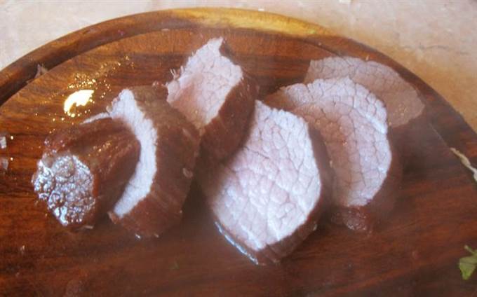 • Готовую, по моему вкусу, говядину я нарезал ломтиками средней ширины поперек волокон.
