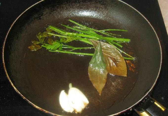 • Сначала нужно подготовить масло. В, разогретом на сковородке, растительном масле я обжарил раздавленный зубчик чеснока, листики лаврушки и веточки зелени. Это не только придаст маслу аромат, но и очистит его от ненужных примесей.