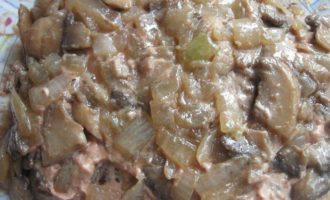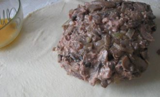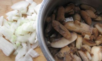 Порезать мелко лук и грибы. Выложить лук на сковороду со сливочным маслом, слегка обжарить, добавить порезанные грибы и готовить, пока не испарится почти вся влага. Остудить.