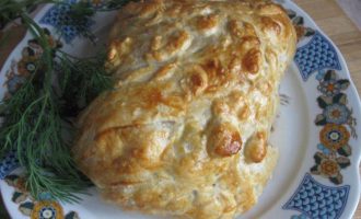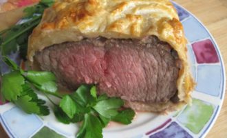 Из оставшегося теста можно сделать небольшие украшения. Можно вырезать листочки или волнистым колесиком полоски. Смазать тесто и украшения желтком. Застелить противень бумагой для запекания, поместить на него мясо и отправить в духовку, разогретую до 220 градусов на 15 минут, затем снизить температуру до 180 градусов и запекать еще 25 минут. Вынуть мясо из духовки и дать ему постоять минут 10.