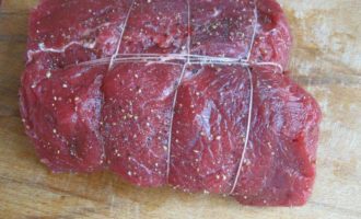 Мясо посолить, поперчить. Обвязать кулинарной нитью.