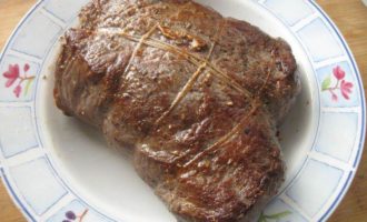 Разогреть сковороду с оливковым маслом, обжарить мясо со всех сторон до румяной корочки, снять с огня, остудить.