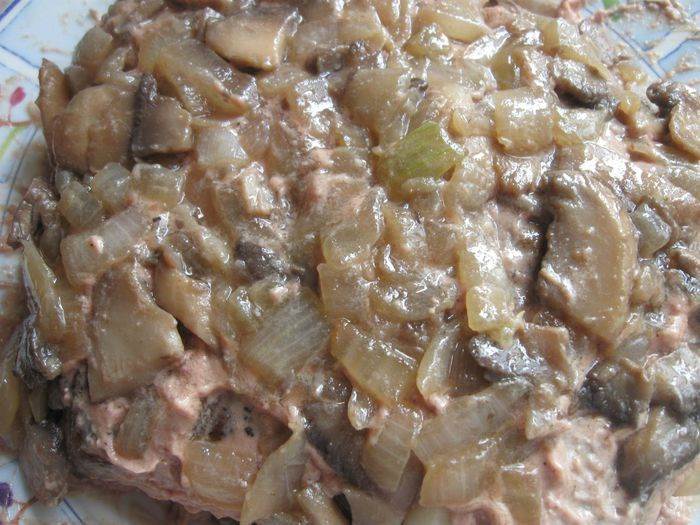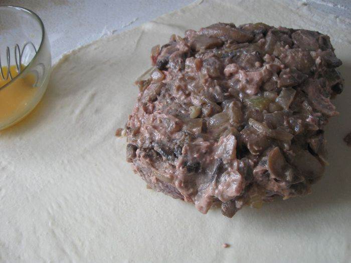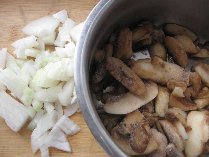 Порезать мелко лук и грибы. Выложить лук на сковороду со сливочным маслом, слегка обжарить, добавить порезанные грибы и готовить, пока не испарится почти вся влага. Остудить.