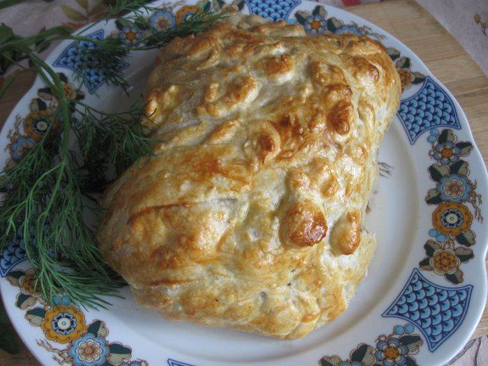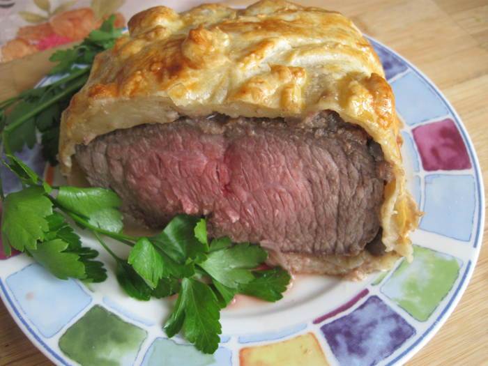 Из оставшегося теста можно сделать небольшие украшения. Можно вырезать листочки или волнистым колесиком полоски. Смазать тесто и украшения желтком. Застелить противень бумагой для запекания, поместить на него мясо и отправить в духовку, разогретую до 220 градусов на 15 минут, затем снизить температуру до 180 градусов и запекать еще 25 минут. Вынуть мясо из духовки и дать ему постоять минут 10.