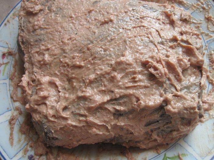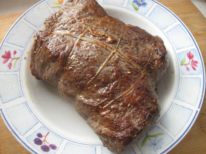 Снять с мяса кулинарную нить, обмазать мясо паштетом.
