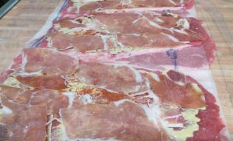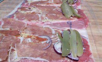 • Выложить ролады ветчиной (в идеале пармской или схожей ветчиной очень тонкой нарезки, но подойдет также и сырокопченый бекон).