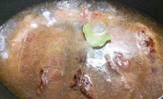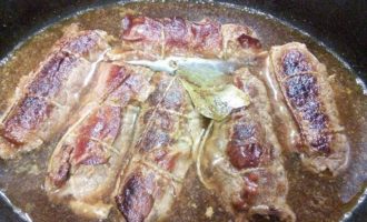 • Влить говяжий бульон (у меня часто для таких случаев есть бульон в заморозке), положить в сотейник лавровый лист и запекать в заранее разогретой до 180°С духовке 1, 5 часа.