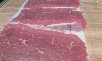 • Для ролад подходит говяжья мякоть (огузок), нарезанная тонкими шайбами. Если воспользоваться услугами вашего знакомого мясника, то мясо и отбивать не понадобится. Мясо нужно обмыть и обсушить салфеткой.