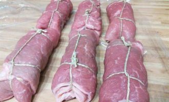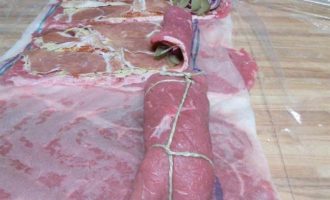 • Закрутить мясо в рулеты, концы подгинать не обязательно, зато необходимо связать ролады пищевой ниткой.