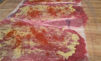 • Смазать горчицей, посолить и поперчить, посыпать порошком сладкой паприки.