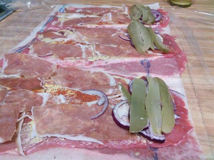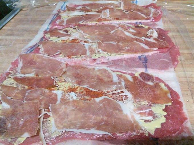 • Выложить ролады ветчиной (в идеале пармской или схожей ветчиной очень тонкой нарезки, но подойдет также и сырокопченый бекон).