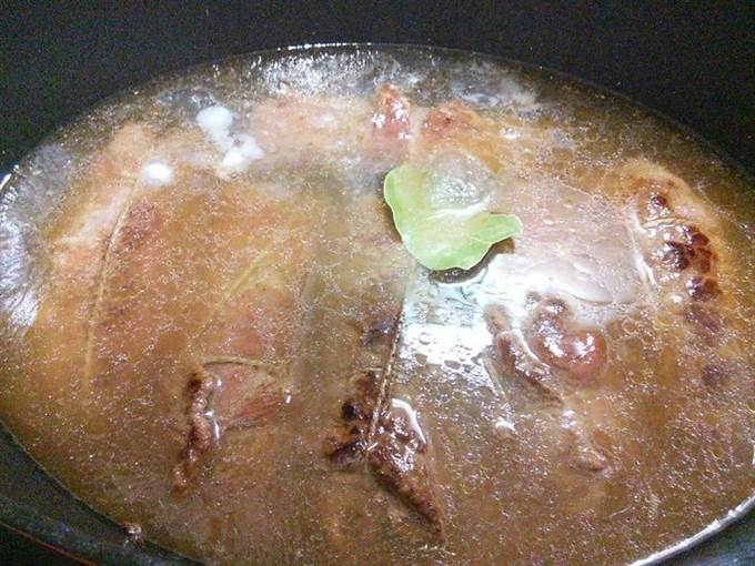 • Влить говяжий бульон (у меня часто для таких случаев есть бульон в заморозке), положить в сотейник лавровый лист и запекать в заранее разогретой до 180°С духовке 1, 5 часа.