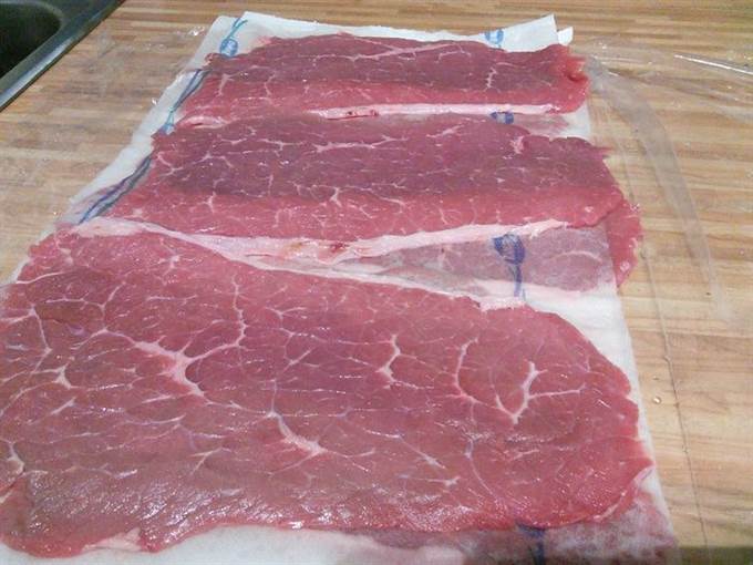 • Для ролад подходит говяжья мякоть (огузок), нарезанная тонкими шайбами. Если воспользоваться услугами вашего знакомого мясника, то мясо и отбивать не понадобится. Мясо нужно обмыть и обсушить салфеткой.