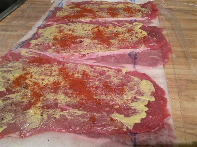 • Смазать горчицей, посолить и поперчить, посыпать порошком сладкой паприки.